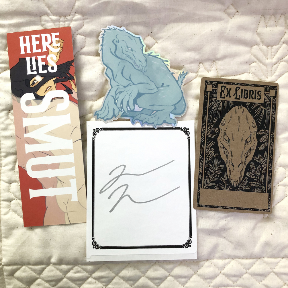 Deck out your book with this kit! Includes 1 double-sided bookmark, 1 bookplate signed by me, 1 Ex Libris bookplate, and 1 holographic sticker.